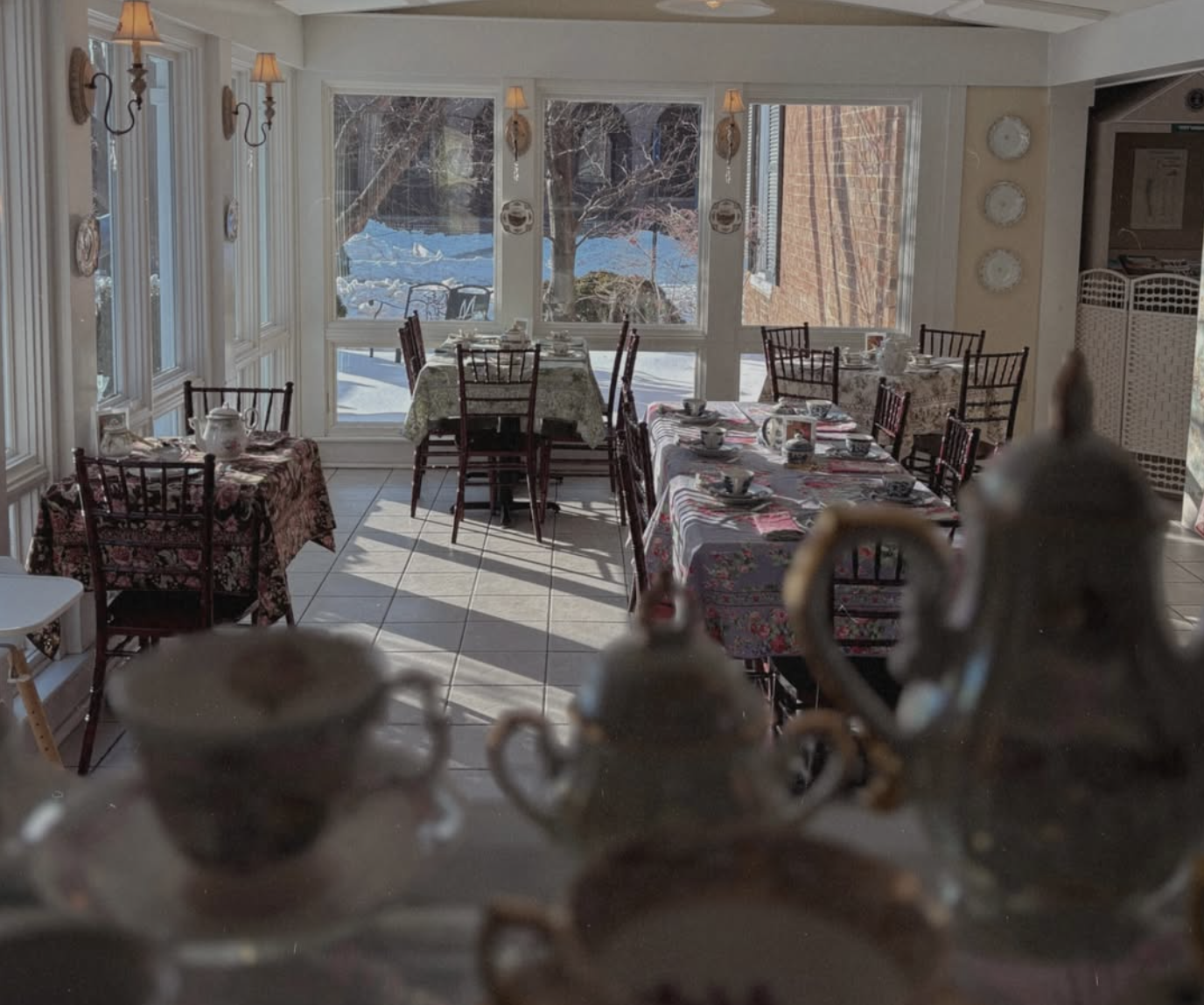 Walking into Heritage on a Sunday afternoon, guests encounter tables covered in vibrant floral tablecloths, antique teacups and saucers, mismatched china collected over ten years, and an atmosphere that's anything but stuffy.