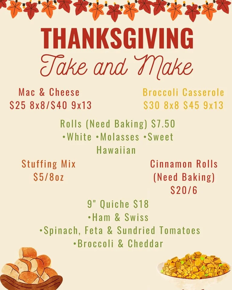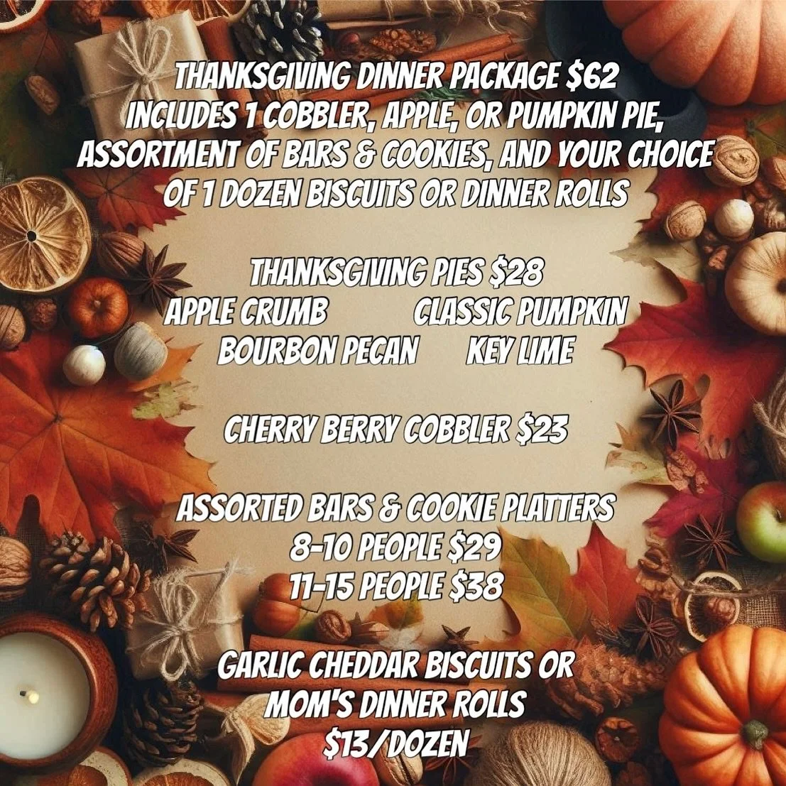 Crack O’ Dawn has a Thanksgiving menu with all kinds of Thanksgiving favorites! Choose from a selection of pies, cakes, and cinnamon rolls, as well as savory options such as mac & cheese and a broccoli casserole. The last day to order is November 23rd. Pick-up will take place on November 26th and 27th.