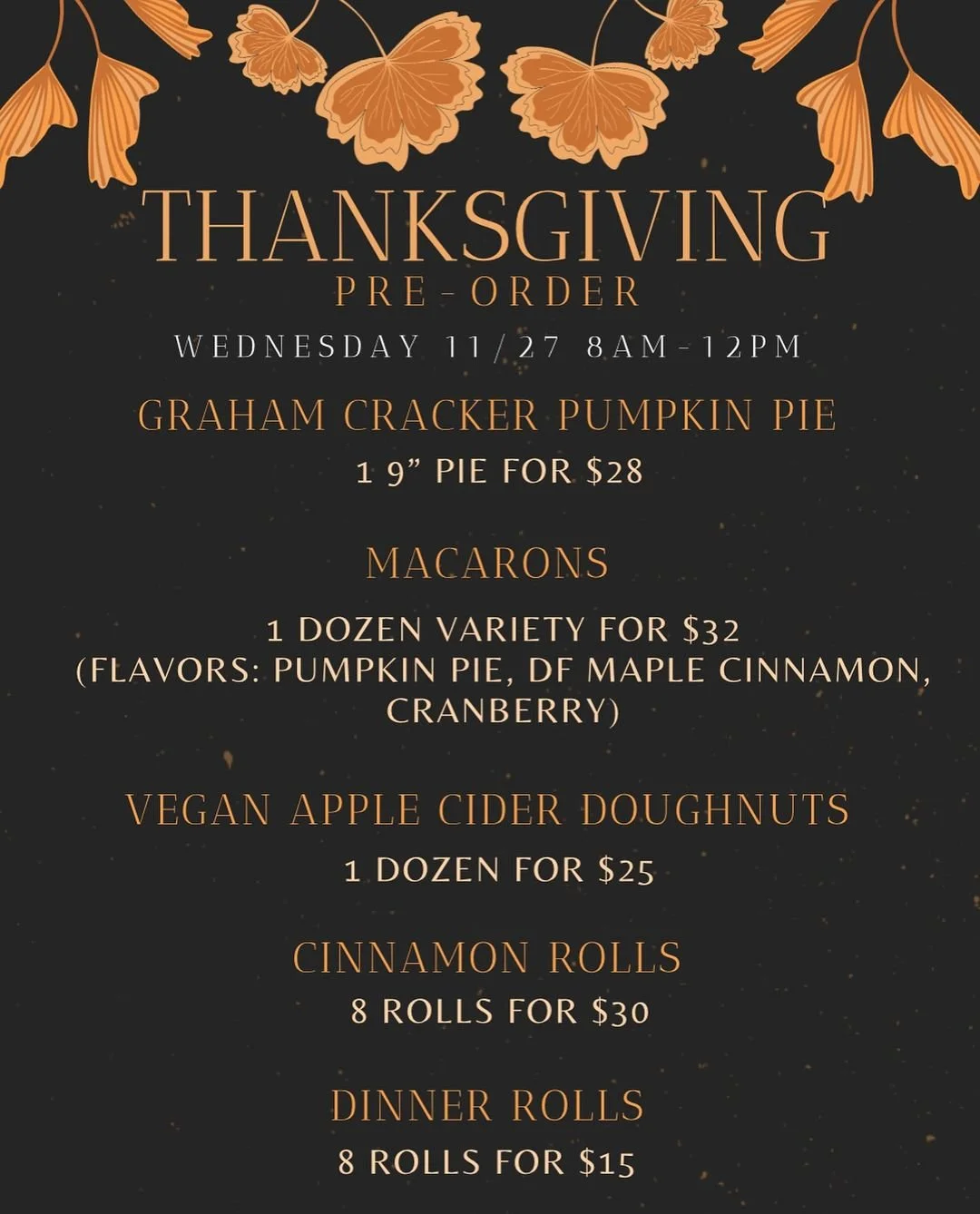 Pre-order delicious gluten-free desserts from BMC Bakes for Thanksgiving! They have a lot of amazing options, such as a graham cracker pumpkin pie, macarons (flavors: pumpkin pie, maple cinnamon, and cranberry), vegan apple cider doughnuts, cinnamon rolls, and dinner rolls. Call in during business hours or visit their shop to fill out the order form. Pick-up will be available on Wednesday, November 27th from 8AM–12PM.