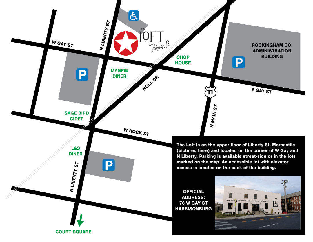 Street parking will be available, along with spaces at the Rockingham County Admin Office Parking, at no charge. Limited parking is also available at the Magpie/Mercantile Lot across from Magpie. Parking spaces behind The Mercantile will be reserved for those who have specific ADA requirements.